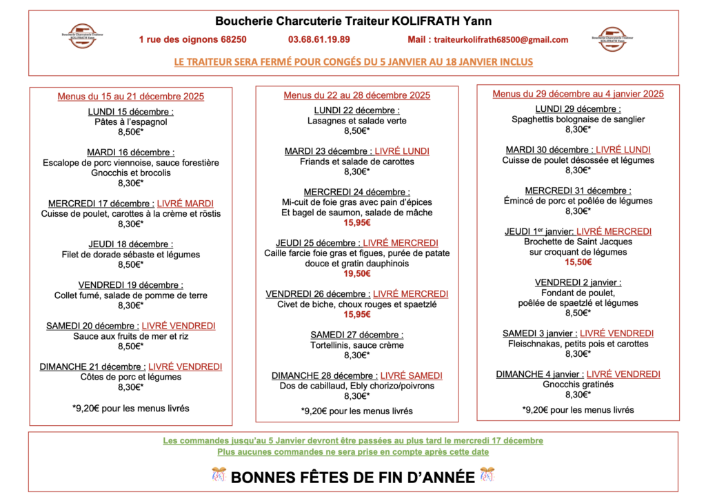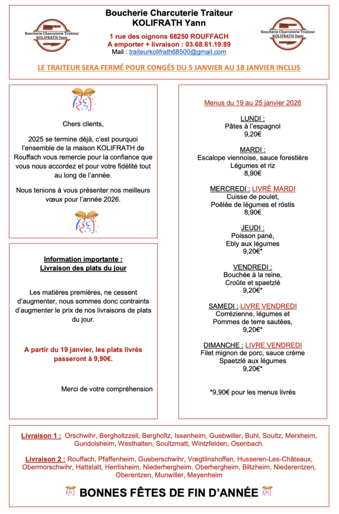 Avec l’extension de notre activité, nous avons décidé de vous offrir la possibilité d’être livré directement à votre domicile uniquement pour les plats du jour. Notre équipe de livraison interne se tient prête à répondre à votre demande pour des produits traiteurs et de boucherie, charcuterie frais et faits maison.